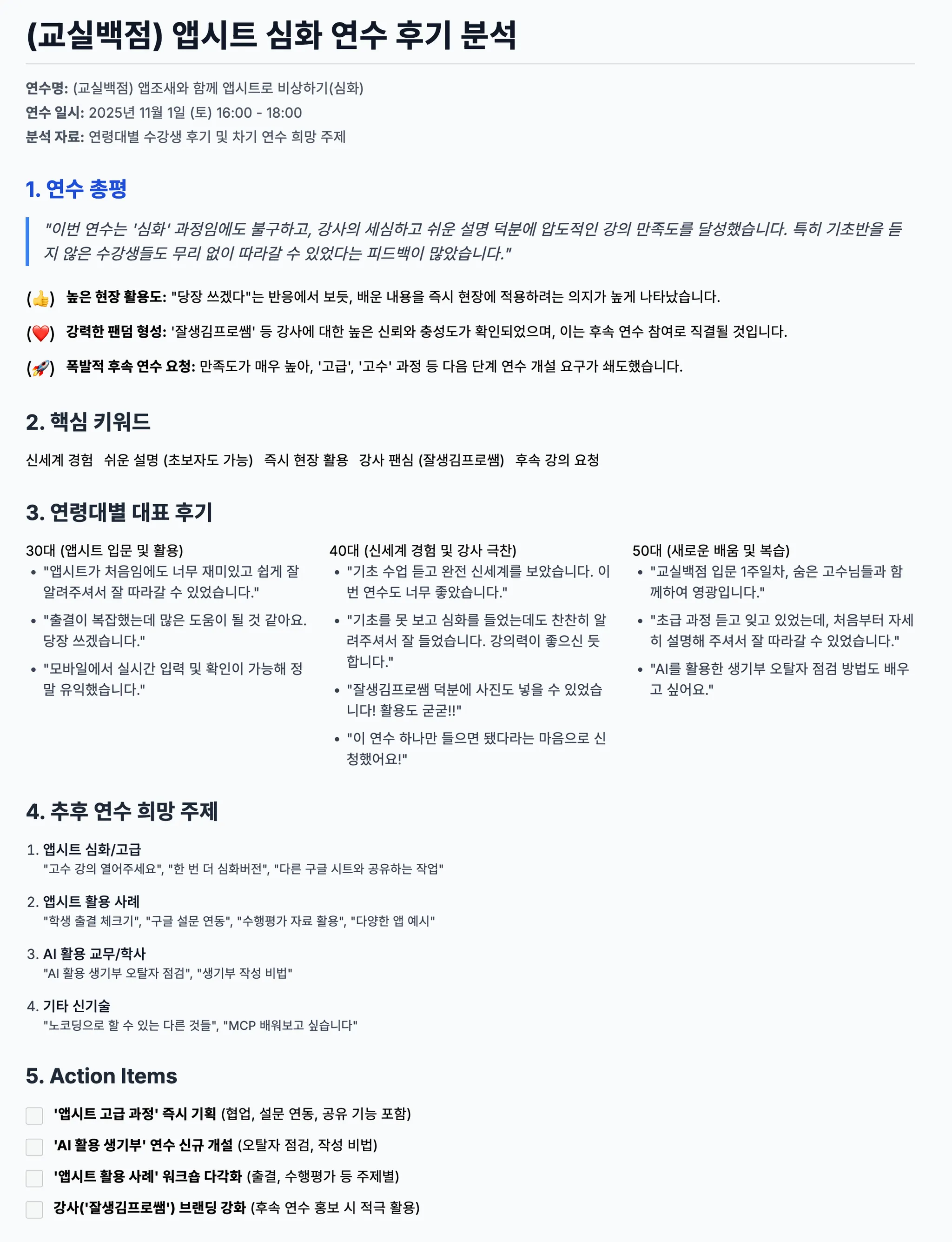 '(교실백점)앱조새와 함께 앱시트로 비상하기(심화)' 연수 후기 분석 (2025-11-01)