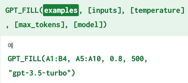 =GPT_FILL(예시자료, 입력, 창의성, 말풍치 최대치(<4000), 모델(기본 모델은 gpt-3.5-turbo))
