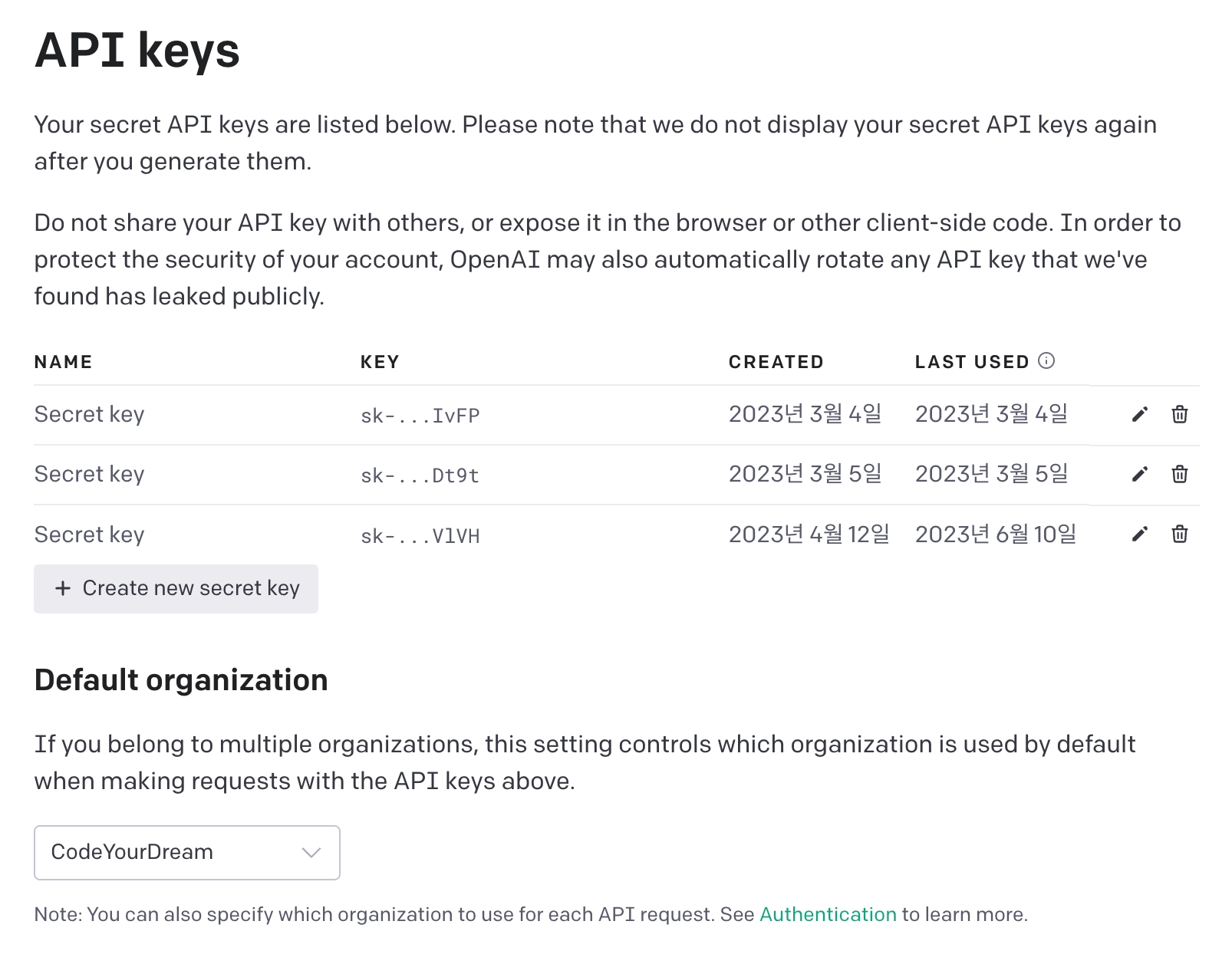 로그인한 후, "Create new API key" 버튼을 클릭