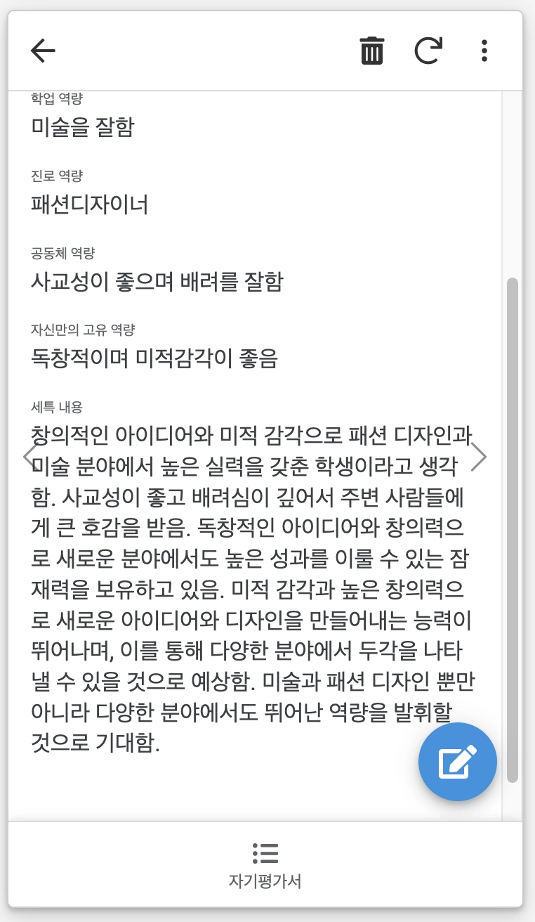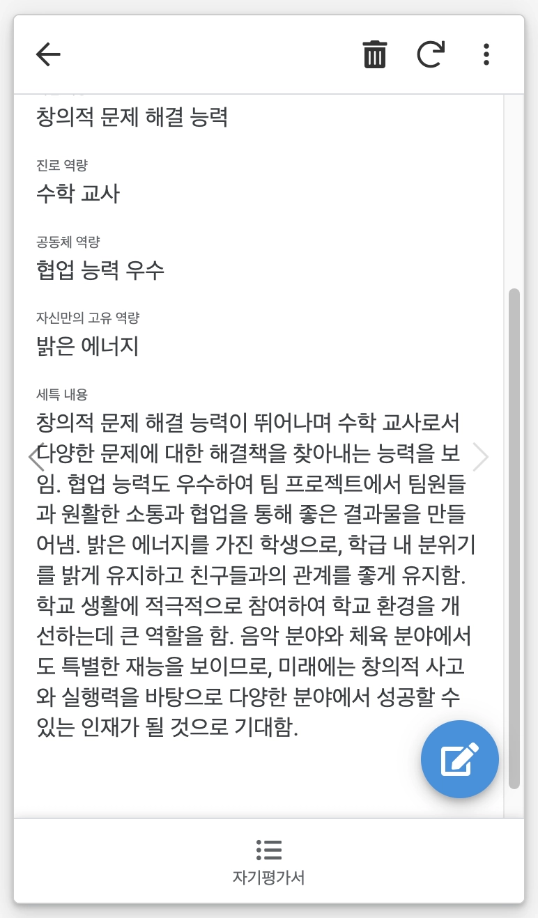 수행평가 준비, 학생부 기록용 자율활동 내용 작성, 세부 능력 특기 사항 작성,