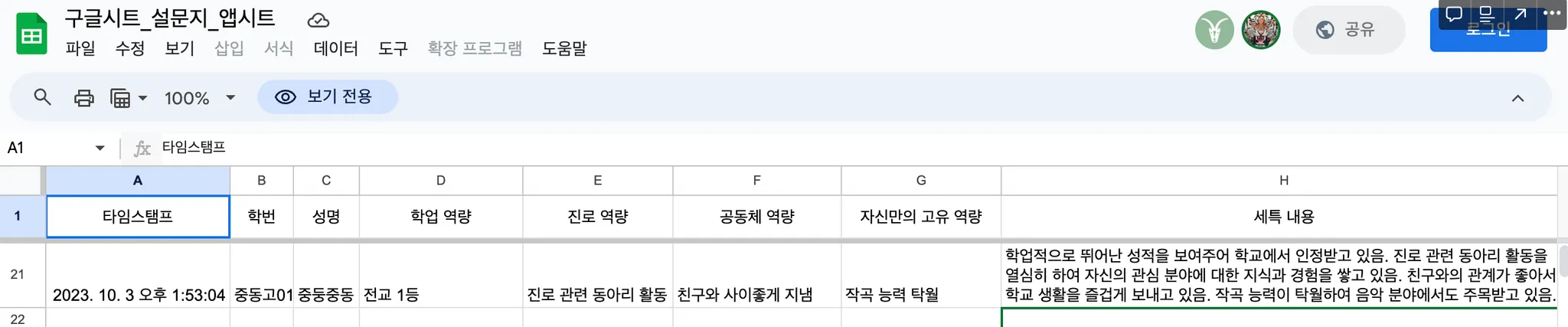 노션에서 구글 시트로 바로 입력할 수 있지만 학생들 자기 평가서 자료 수합은 구글 시트가 편하므로 시도하지 않음